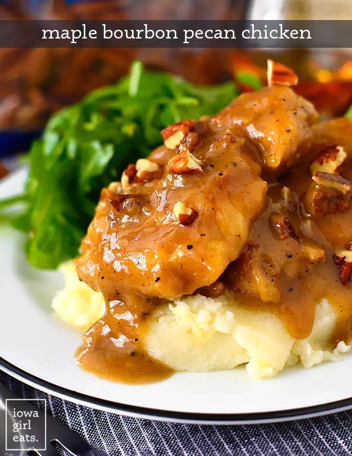 Iowa Girl Eats delivers big flavor with this Maple Bourbon Pecan Chicken recipe. The maple-Dijon sauce is spiked with bourbon and simmered until syrupy and sticky — YUM.