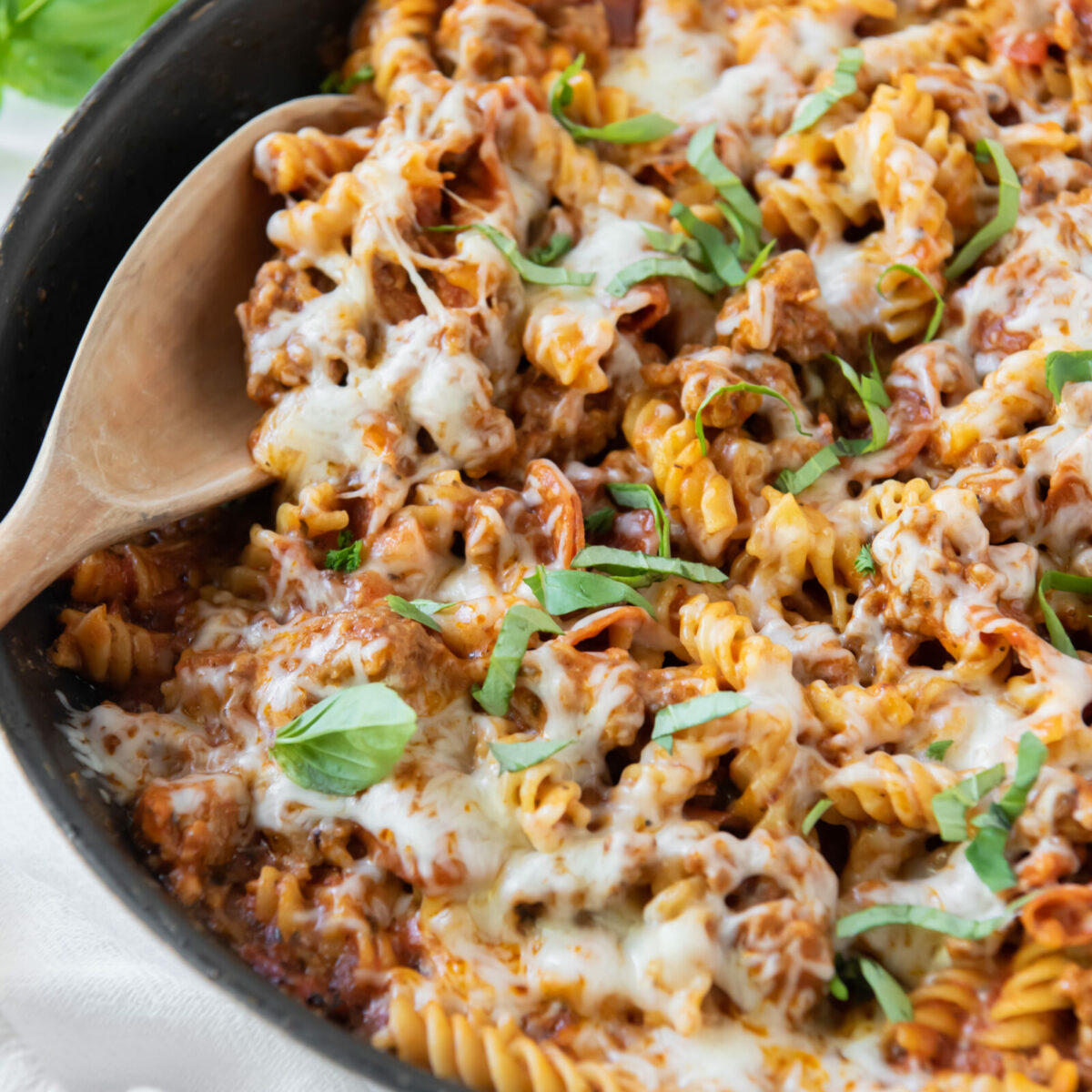 This One Pan Pizza Pasta contains all of the classic pizza flavors packed into a one pan meal that is sure to satisfy your cravings. Filled with tender pasta, spicy sausage, lean pepperoni, and topped with cheese, this meal is sure to be a hit with everyone!